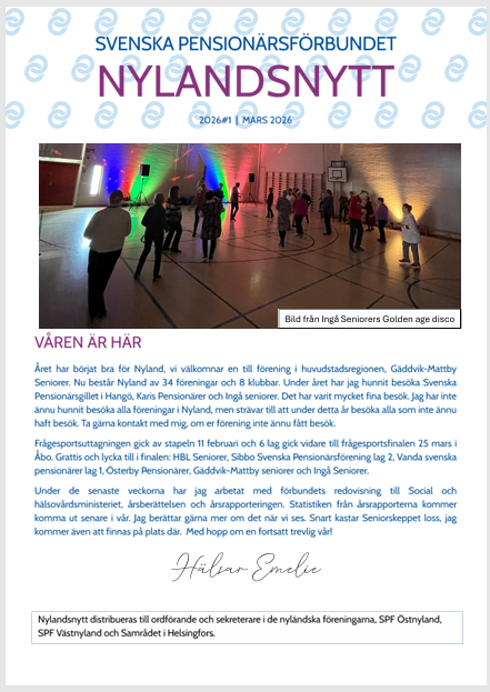 Här samlas de nyhetsbrev som kommer börja skickas ut från och med hösten 2024 till alla Svenska pensionärsförbundets nyländska föreningar. Nylandsnytt skickas till ordförande, sekreterare i föreningarna samt SPF Västnyland, Samrådet i Helsingfors, SPF Östnyland samt förbundets styrelsemedlemmar från Nyland.